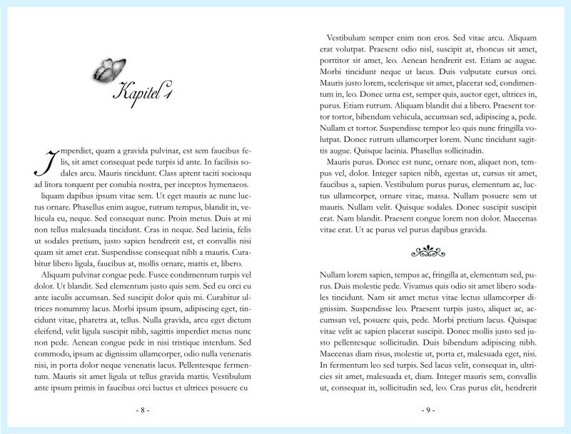 Du erhältst einen professionellen Buchsatz, ergänzt durch stilvolle Kapitelzierden und dezente Schmuckelemente, die deinem Buch ein ansprechendes und individuelles Layout verleihen.