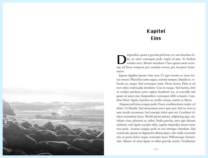 Du erhältst einen professionellen Buchsatz, der sich auf das Wesentliche konzentriert – ohne Kapitelzierden und Schmuckelemente. Auf Wunsch gestalten wir den Kapitelanfang mit Initialen für eine dezente Veredelung.